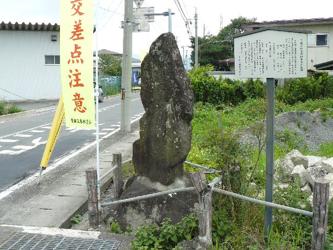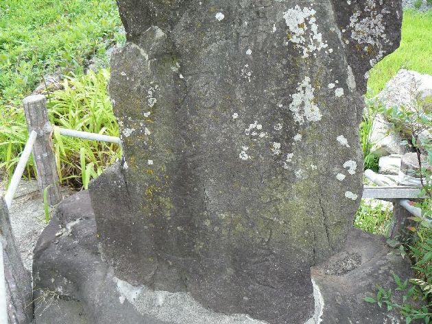 三本松の元禄4年追分板碑(上山市)概要: 羽州街道と米沢街道の追分碑には「南無阿弥陀仏、元禄四年辛未年七月十五日、右ハよ年さわ、左ハ江とみち」と刻み込まれています。これにより江戸時代中期の元禄4年(1691)に建立され、弥陀の梵字が彫られている事から当初は供養塔でその後道標の機能が追加されたと推測されます。「上山見聞随筆」によると、この板碑の巨石を七夕と呼ばれる関取が背負って運んだ事が記されているそうです。碑の大きさは高さ170.0p、幅75.0p、厚さ35.0p、昭和54年(1979)に上山市指定文化財(考古資料)に指定されています。