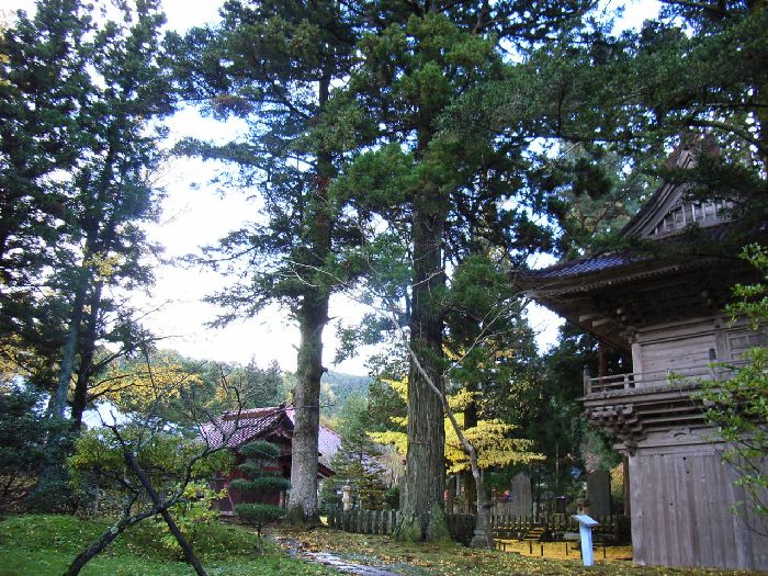 | 総光寺の杉(酒田市松山町)概要: 総光寺の杉は案内板によると「総光寺の山門の北側に1本南側に1本並んでいるスギで南側のスギは樹齢260年といわれ、その特徴は40mを越す高さにある。県内でも珍しいもので大きく太いだけでなく樹幹の色の美しさも抜群である。なお、山門の北側にある1本の古スギは樹齢おおよそ600年といわれ、荒れた木肌がその年齢を示している。 松山町 」とあります。参道にあるキノコスギとは対象的で、山門を境にして、軟らかい印象から、静寂で緊張感のある空間へ移行する舞台装置のような役目を負っているような感じを受けます。当然、本堂裏の庭園も趣きを変えているので、どんどん空間が変化していく様子が総光寺の特徴なのかもしれません。総光寺の杉は旧松山町の保存樹に選定されています。